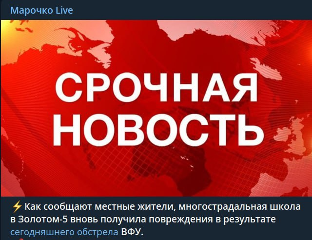 "Как сообщают местные жители, многострадальная школа в Золотом-5 вновь получила повреждения в результате сегодняшнего обстрела ВФУ", - пишет Марочко.