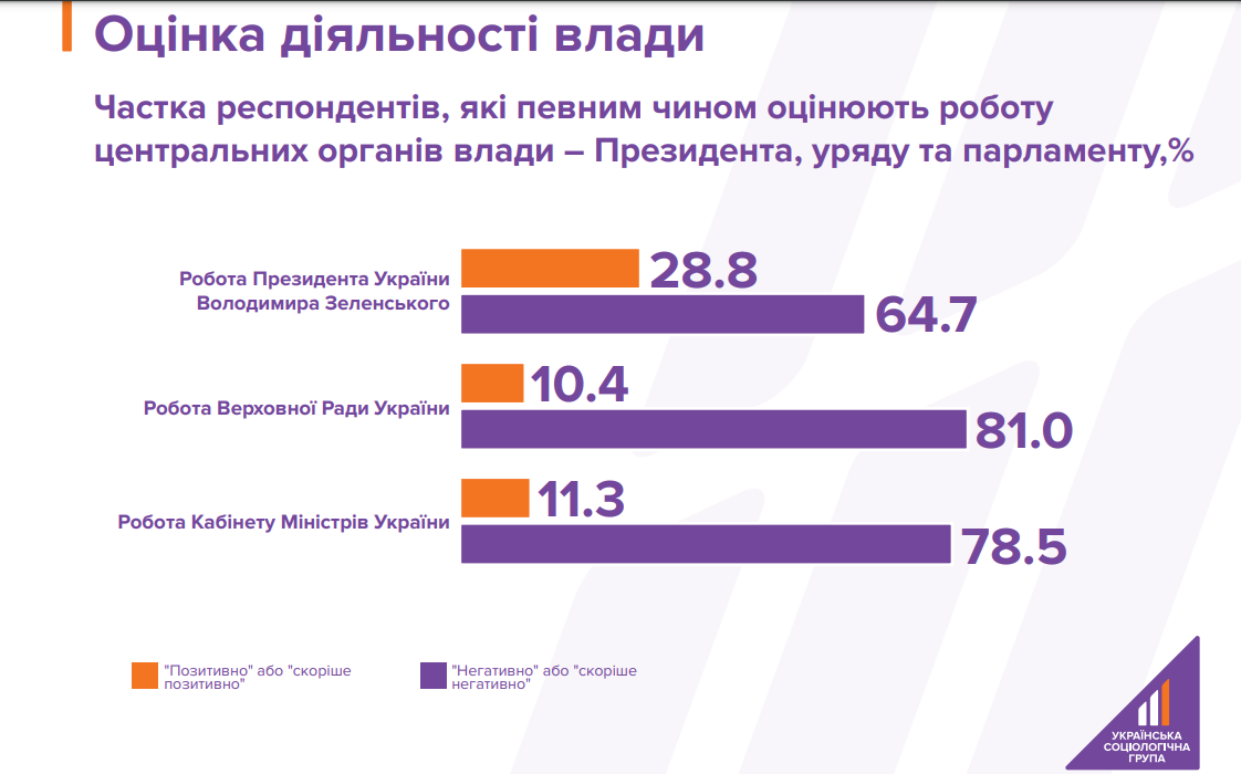 Согласно опросу, 64,7% украинцев негативно оценивают работу президента Владимира Зеленского и только 28,8% отзываются о ней позитивно.