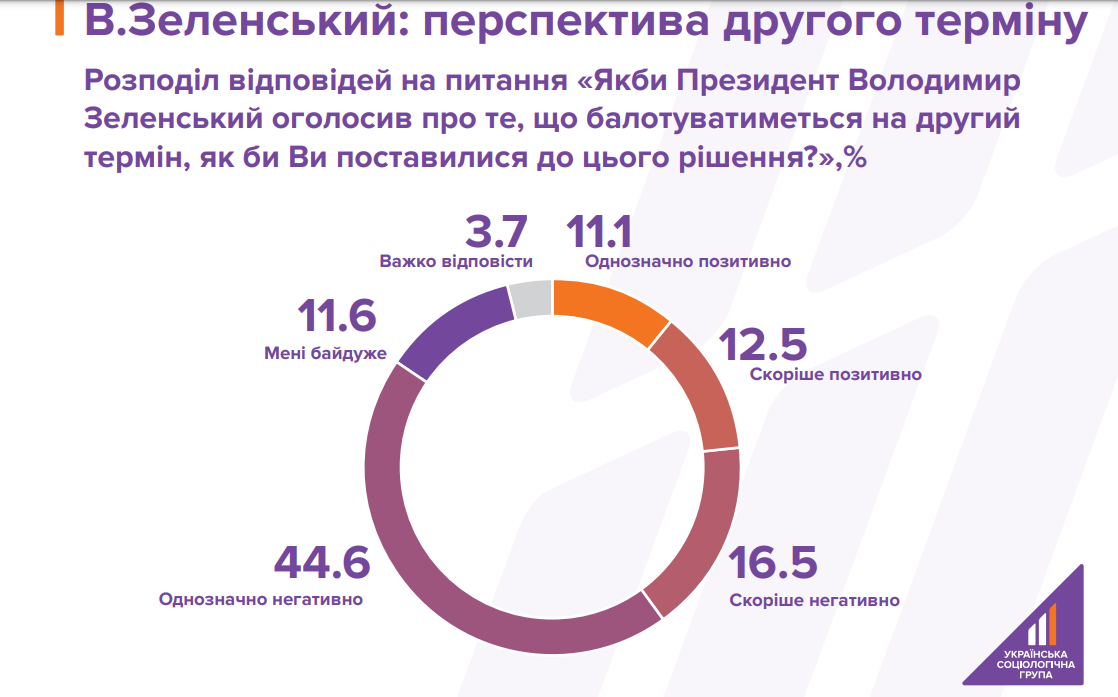 Более 61% украинцев негативно относятся к перспективе второго президентского срока для нынешнего главы государства Владимира Зеленского. Об этом свидетельствуют результаты опроса, который провела Украинская социологическая группа в период с 3 по 10 ноября.