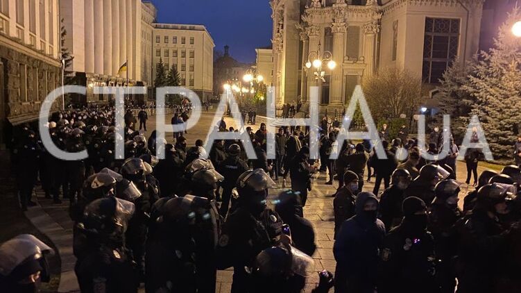 В марше "Не теряем достоинства. Защищаем свободу" принимает участие около 500-700 человек, среди них - большое число сторонников экс-президента Петра Порошенко. Участники марша растянули большой баннер с изображением Владимира Зеленского и руководителя его офиса Андрея Ермака с надписью "Их ложь унижает. Защитим наше достоинство".