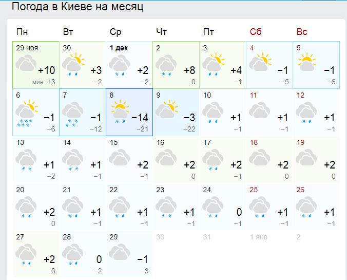 По данным Gismeteo, в целом декабрь будет не слишком холодным. В среднем от -1 до +2 днем в Киеве.
