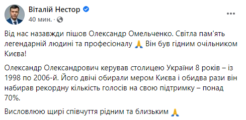 "От нас навсегда ушел Александр Омельченко. Светлая память легендарному человеку и профессионалу. Он был достойным руководителем Киева!