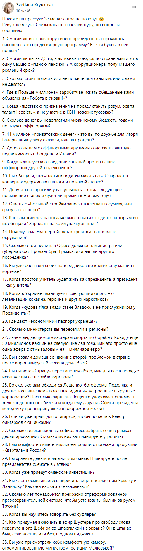 Реву как белуга. Слёзы капают на клавиатуру, но вопросы составила", - написала она, прикрепив 35 важных вопросов к президенту.