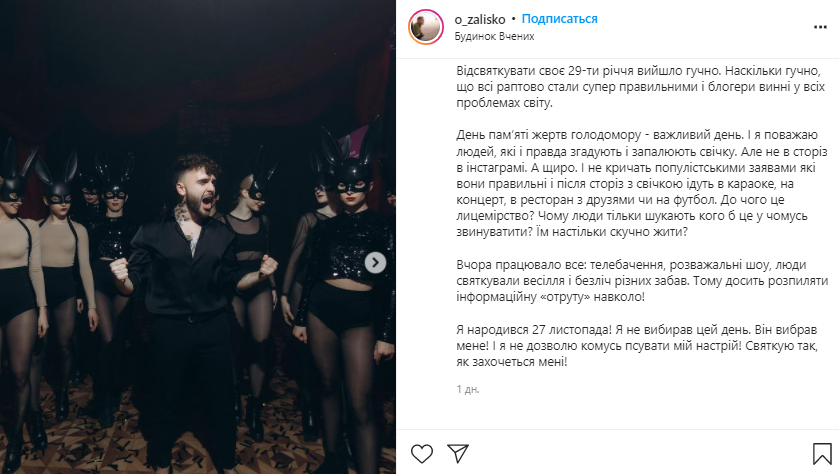Парень отмечал свой 29-й день рождения. И эта дата совпала с днем, когда в Украине чтят память жертв Голодоморов. Поэтому после того, как в сториз начали появляться фото и видео с тусовки, участников тут же обвинили в "цинизме" и "недостойном поведении".