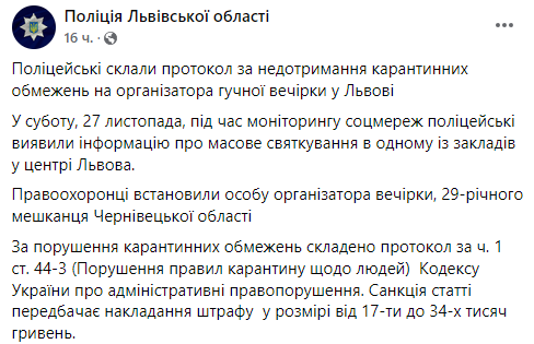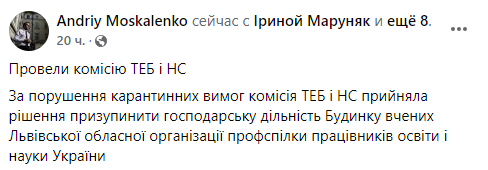 В понедельник, 29 ноября, первый заместитель мэра Львова Андрей Москаленко сообщил, что за нарушение карантинных требований комиссия ТЭБ и ЧС приняла решение приостановить хозяйственную деятельность Дома ученых, где проходила вечеринка.