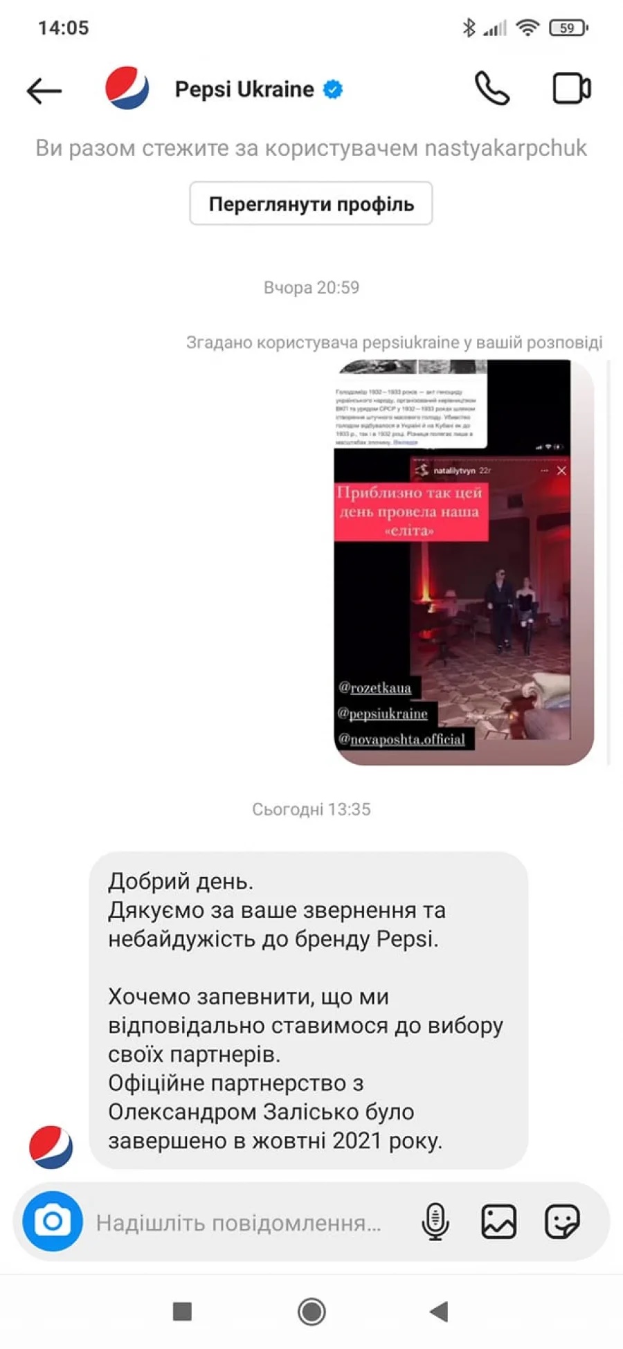 В ответе Pepsi Ukraine говорится, что компания ответственно относится к своим партнерам, и что партнерство с Залиско было прекращено еще в октябре 2021 года (!) И это очень странно с учетом того, что скандал возник только сегодня.