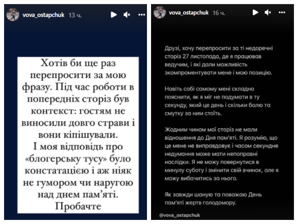 После одного извинения он опубликовал второе, написав, что его сториз не имели отношения к голодомору и он "не мог подумать в ту секунду, какой это день и сколько боли и печали за ним стоит".