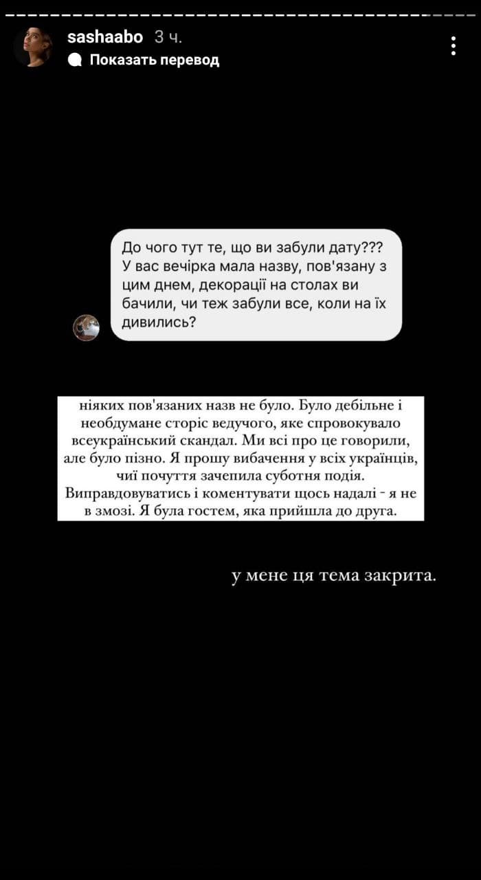 Блогерша Саша Бо (Александра Пустовит) тоже оправдалась за то, что присутствовала на дне рождения Залиско в День памяти голодоморов.