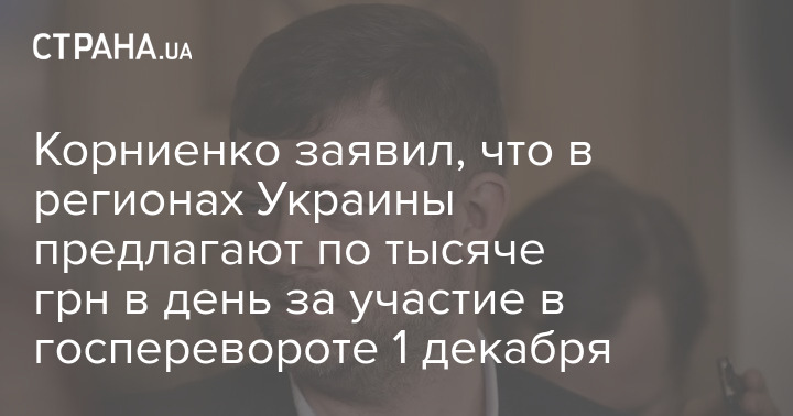 Первый вице-спикер парламента Александр Корниенко на фоне недавнего заявления президента Владимира Зеленского о "возможном госперевороте" заявил, что, в среду, 1 декабря, в Киеве "готовятся какие-то подвозы" людей. Также он добавил, что украинцам предлагают по тысяче гривен в день за участие в госперевороте.