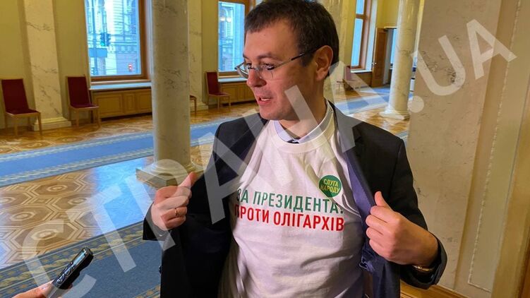 В среду, 1 декабря, в день выступления президента Украины Владимира Зеленского в Верховной Раде, некоторые депутаты фракции "Слуга народа", как и анонсировала "Страна", пришли в футболках с надписью "За президента, против олигархов".