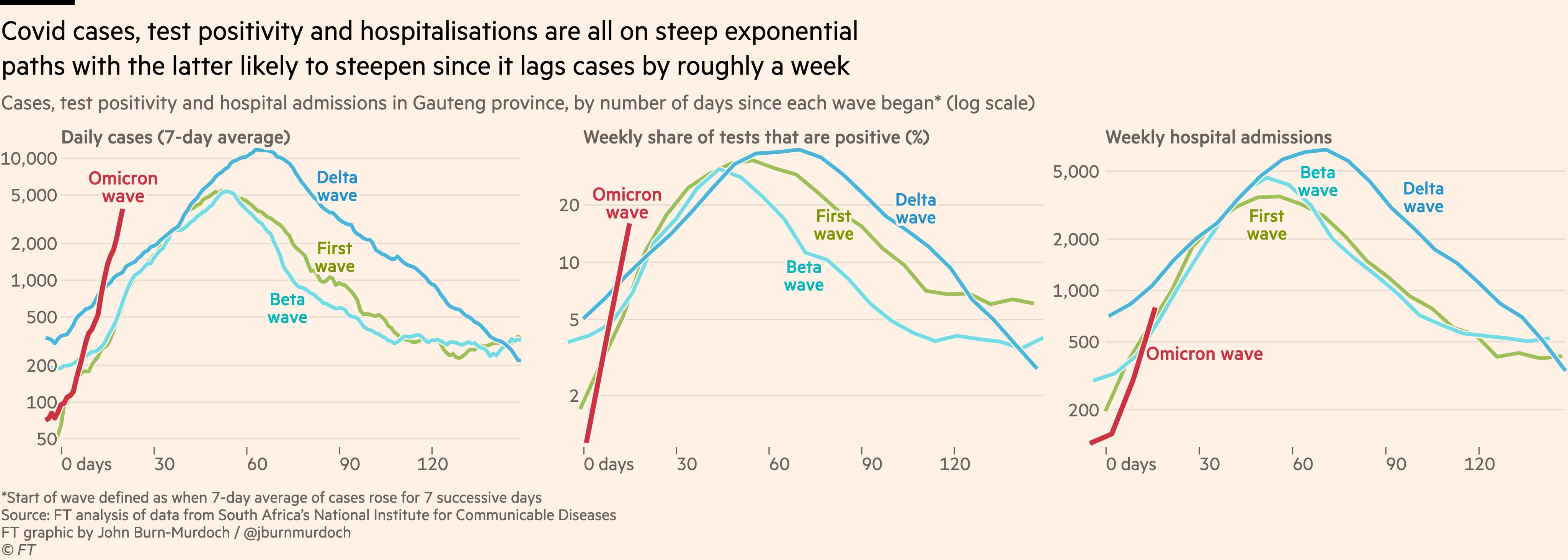 Журналист Financial Times обнародовал график от Gauteng, который в логарифмическом масштабе отображает текущее положение дел с распространением Омикрона - крутизна линий показывает, насколько быстрее растет число случаев и положительных результатов по сравнению с "Дельта" и прежними волнами ковида.
