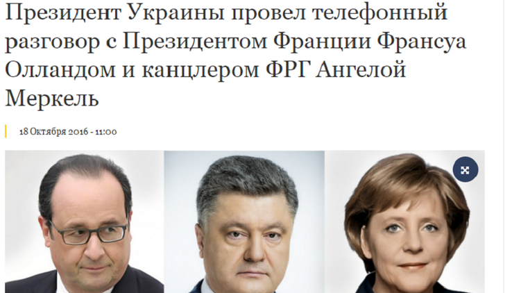 "Отфотошопленную" фотографию Меркель выставили на сайте президента в качестве иллюстрации к новости "Президент Украины провел телефонный разговор с Президентом Франции Франсуа Олландом и канцлером ФРГ Ангелой Меркель". На фото отредактированы возрастные несовершенства, а лицо Меркель выглядит уже, чем на оригинальном фото. В результате обработки в фоторедакторе изменился также цвет и структура лацкана пиджака (см. коллаж).