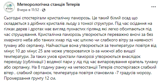 По состоянию на 8:00 понедельника, 6 декабря, на метеостанции Тетерев наблюдался слабый ветер, слабая дымка, температура воздуха составляла -7 градусов мороза. Промерзание грунта 12 см.