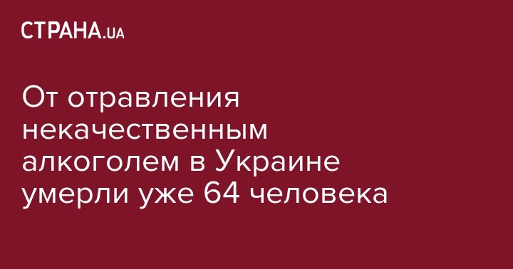 К вечеру вторника, 18 октября 2016 года в Украине официально зарегистрировано уже 142 случая отравления фальсифицированными, некачественными алкогольными напитками. Из них смерть выпивших наступила в 64 случаях. Об этом сообщает пресс-служба Госпродпотребслужбы.