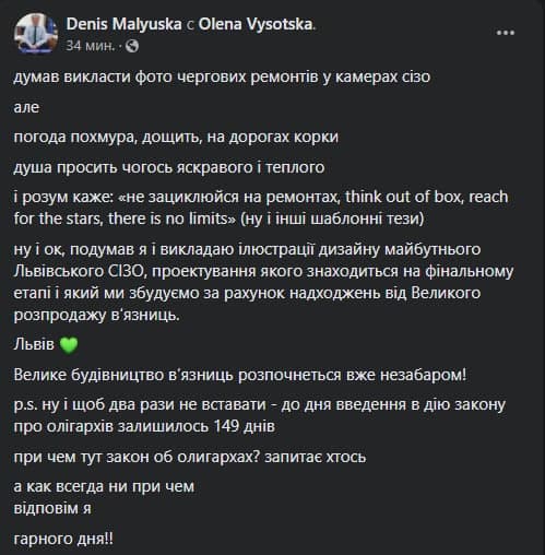 "Подумал я и выкладываю иллюстрации дизайна будущего Львовского СИЗО, проектирование которого находится на финальном этапе и который мы построим за счет поступлений от Большой распродажи тюрем. Львов. Большое строительство тюрем начнется уже скоро!" - анонсировал Малюська.