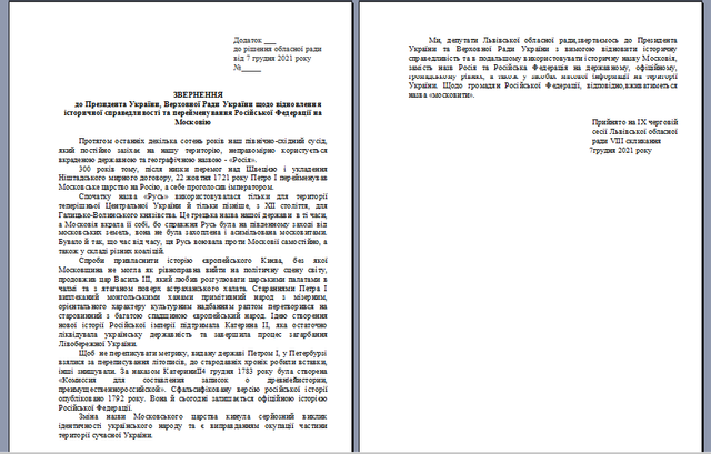 "Мы, депутаты Львовского областного совета, обращаемся к президенту Украины и Верховной Раде Украины с требованием восстановить историческую справедливость и в дальнейшем использовать историческое название "Московия" вместо названий "Россия" и "Российская Федерация" на государственном, официальном, общественном уровнях, а также в средствах массовой информации на территории Украины. В отношении граждан Российской Федерации, соответственно, будет использоваться название "московиты", - сказано в проекте документа.