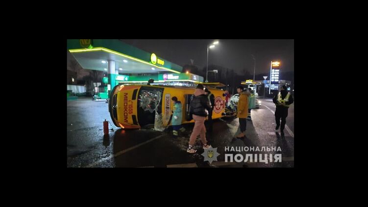 Два медика получили травмы. В Киеве легковушка не пропустила скорую помощь, которая перевернулась. Фото