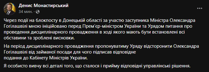 "Из-за событий на блокпосту в Донецкой области с участием заместителя Министра Александра Гогилашвили мною инициирован перед Премьер-министром Украины и Правительством вопрос о проведении дисциплинарного производства, в ходе которого должны быть установлены все обстоятельства и сделаны выводы. На период дисциплинарного производства буду предлагать правительству отстранить Александра Гогилашвили от занимаемой должности для чего подписал соответствующее представление в Кабинет Министров Украины. Я лично изучу все детали произошедшего и приму соответствующие управленческие решения", - заявил Монастырский.