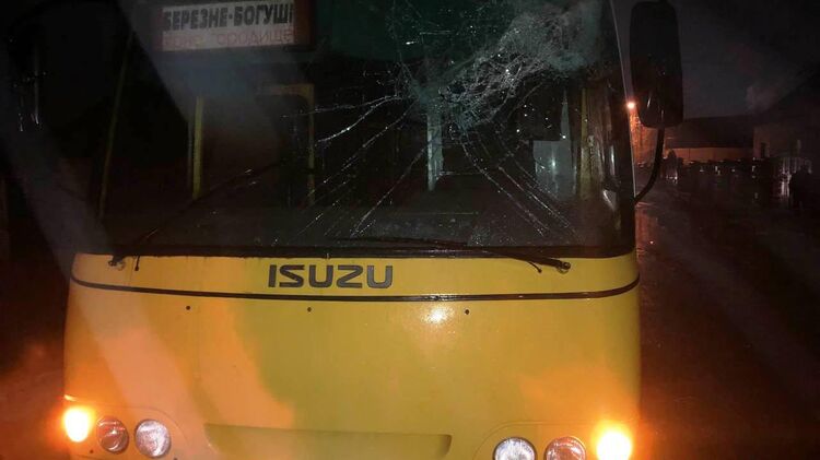 Бревна попали в лобовое и боковое стекла маршрутки. Фото: полиция Ровенской области