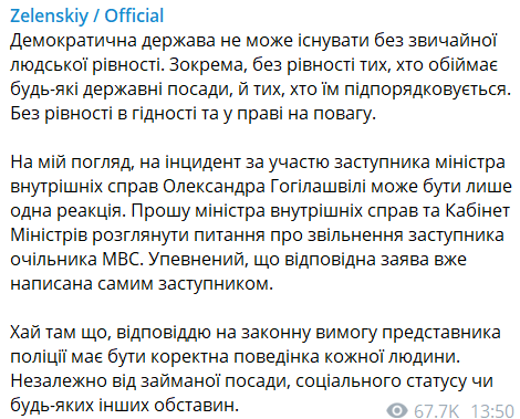 Он попросил Кабмин рассмотреть вопрос отставки замминистра внутренних дел и заявил, что тот уже написал заявление. И заявил, что чиновники должны корректно вести себя с работниками полиции.