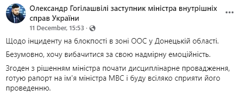 11 декабря на недавно созданной странице Александра Гогилашвили в Facebook появились извинения за инцидент на въезде в Донецкую область.