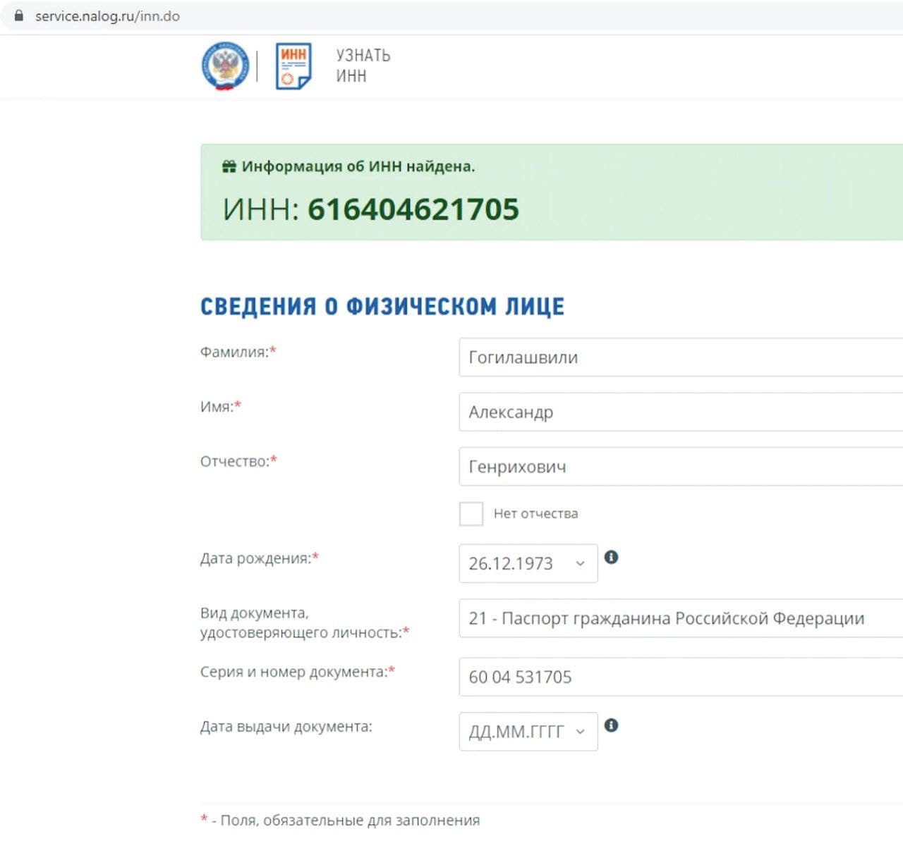 Об этом свидетельствуют данные на сайте Федеральной налоговой службы России, где по ИНН можно узнать, есть ли у гражданина российский паспорт.