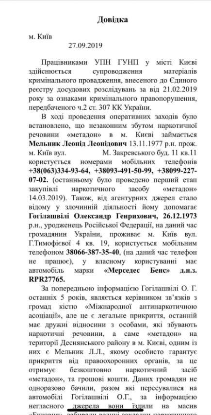В оперативной справке по тому же производству, которая еще со вчерашнего дня гуляет в Сети, пишется, что дело открыли по статье 307, части 2 - "Сбыт наркотиков группой лиц по предварительному сговору". Гогилашвили, по агентурным данным полиции, помогал торговать наркотой жителю Киева Леониду Мельнику.