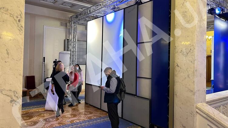 Экран трансляции заседаний перекрыт студией телеканала "Рада". Фото: Страна