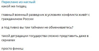 "Какой же @здец. главный военный разведчик в условиях конфликта живёт с гражданином России. А под пивко вы там тайнами не обмениваетесь?