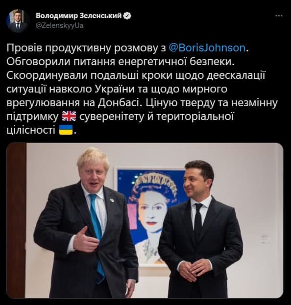 Провел продуктивный разговор с Борисом Джонсоном - Ред.. Обсудили вопросы энергетической безопасности. Скоординировали дальнейшие шаги по деэскалации ситуации вокруг Украины и мирному урегулированию на Донбассе. Ценю твердую и неизменную поддержку  Великобритании суверенитета и территориальной целостности Украины", - написал президент Украины.