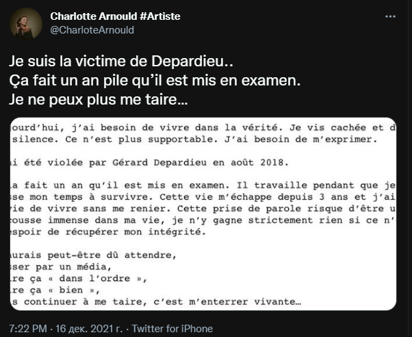 В феврале текущего года адвокат кинозвезды Эрве Темим заявил, что его подзащитный находится на свободе, но под надзором суда. Сам Депардье полностью отвергает все обвинения в свой адрес после возобновления расследования.