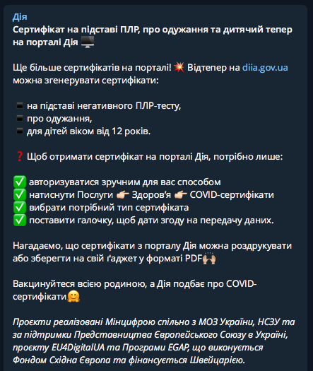 "Вакцинируйтесь всей семьей, а "Дия" позаботится о СOVID-сертификатах", - завершается сообщение ведомства.