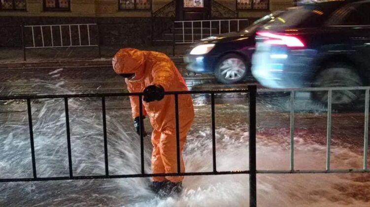 Во Львове коммунальщик час простоял на люке, из-под которого бил фонтан. Фото: Эспрессо