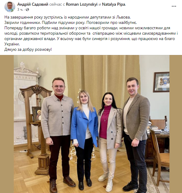 "В завершение года встретились с народными депутатами из Львова. Сверили часы. Подвели итоги года. Поговорили о будущем", - подписал фото львовский градоначальник.