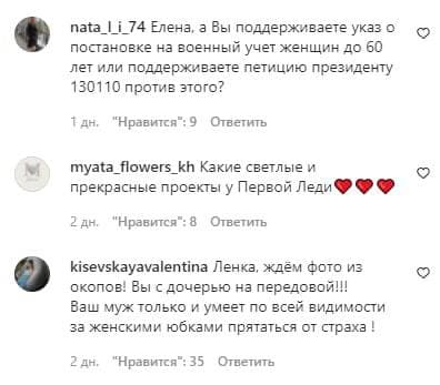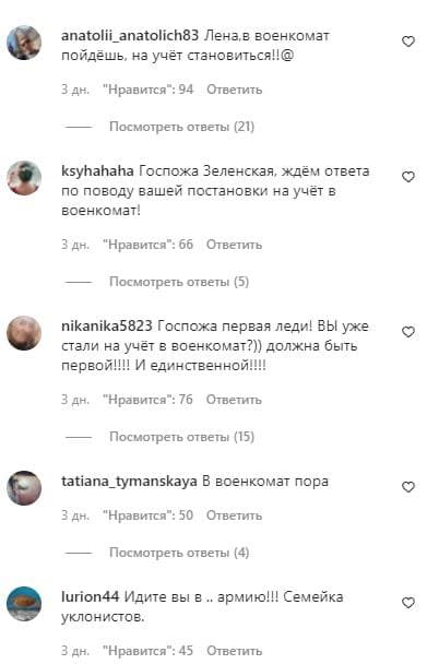 Украинцы массово спрашивают у жены президента Украины Елены Зеленской на ее странице в Инстаграмме, стала ли она на воинский учет, согласно скандальному приказу Минобороны.
