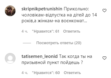 "Прикольно: мужчинам - отпуск на детей до 14 лет, а женщинам - на военкомат", - пишет один из пользователей. А второй тут же интересуется, когда именно Елена Зеленская пойдет в военкомат.
