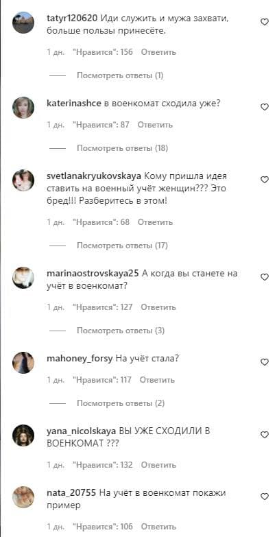 "На учет в военкомат стала?? Больше ни какие твои достижения не интересны?", - пишет еще один подписчик.