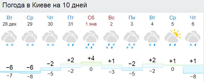 В Киеве на Новый год в Gismeteo обещают потепление и дождь со снегом. Днем 31-го декабря до +2, ночью -2.