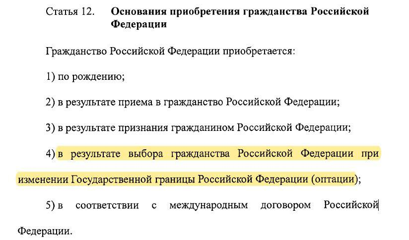 Интересно, что в законопроекте прописано новое основание для приобретения гражданства России - в результате выбора гражданства Российской Федерации при изменении Государственной границы Российской Федерации (оптации).