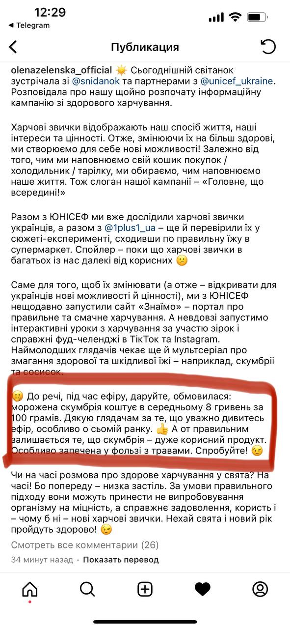 Позже у себя в Instagram Зеленская заявила, что оговорилась, а скумбрия на самом деле стоит дороже в 10 раз, т.е. она имела в виду, что скумбрия стоит 8 грн за 100 граммов, а не за килограмм.