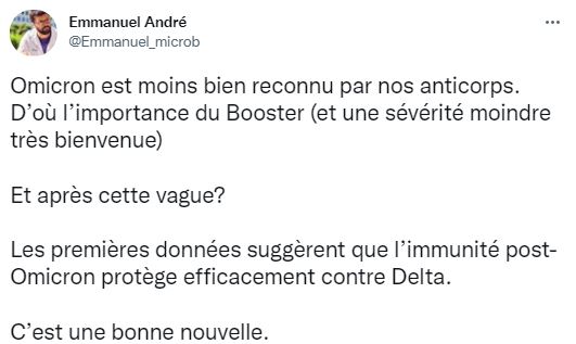 Еще один бельгийский эксперт, известный в стране микробиолог Эмманюэль Андре, написал, что хотя "Омикрон" и более заразный, поскольку его хуже распознают антитела, однако первичные данные показывают, что иммунитет после этого штамма также эффективно защищает и против варианта "Дельта".