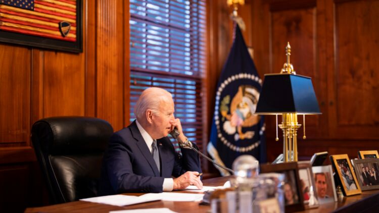 Пресс-служба Белого дома распространила фотографию президента США Джо Байдена, разговаривающего по телефону с главой Кремля Владимиром Путиным.