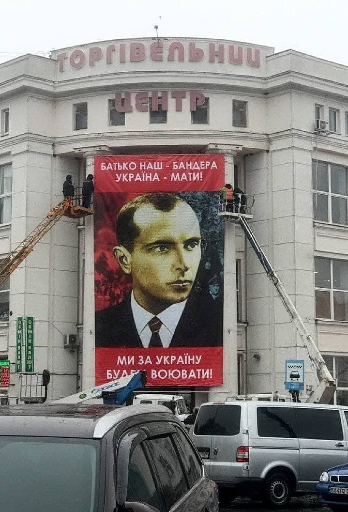 В Хмельницком вывесили баннер с изображением Степана Бандеры. Фото: telegram