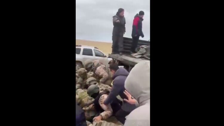 В Актау на северо-западе Казахстана протестующие захватили грузовик с силовиками. Они заставили военных покинуть авто. На опубликованном в сети видео можно рассмотреть, как военных выталкивают из грузовика и ставят на колени.
