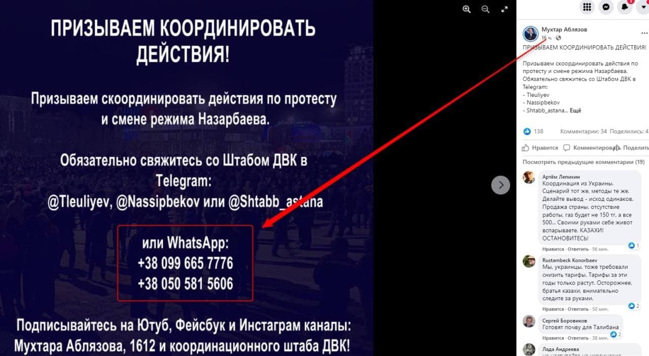 Казахский топ-оппозиционер Мухтар Аблязов на своей странице в Facebook обратился к участникам протестов, а также призвал "координировать действия". Номера, которые были указаны в опубликованном им обращении, имеют коды украинских операторов.