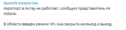 В охваченном протестами Казахстане прекратил работу аэропорт в Актау (столица закрытой на въезд и выезд Мангистауской области). Об этом сообщил представитель Air Astana. В Мангистауской области введен режим ЧП.