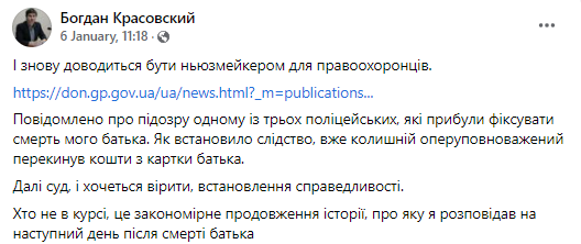 "Сообщено о подозрении одному из трех полицейских, прибывших фиксировать смерть моего отца. Как установило следствие, уже бывший оперуполномоченный перекинул средства с карточки отца", - написал активист в соцсети.