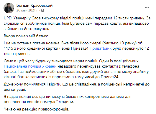 "Именно в это время в доме находился полицейский наряд. Один из полицейских незадолго переписывал контакты с телефона отца. И при невероятном стечении обстоятельств уже второй день я не могу найти в комнате отца записную книжку с паролями в том числе в Приват24", - пояснил Красовский.