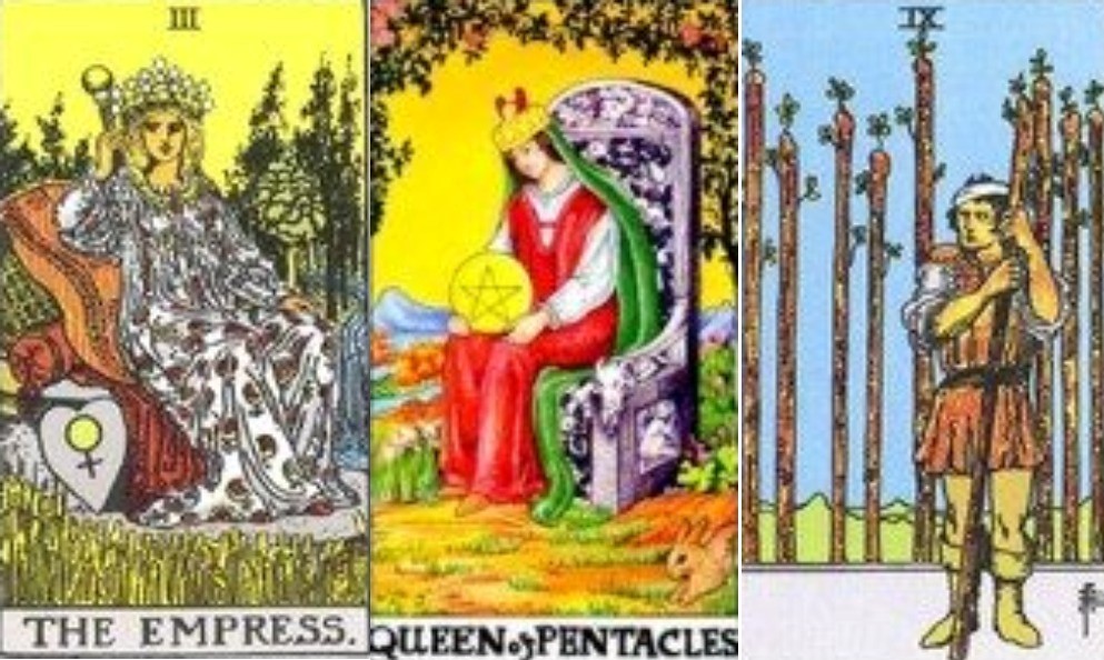 Вам выпал старший аркан Императрица и младшие арканы - королева пентаклей и девятка жезлов (сила).