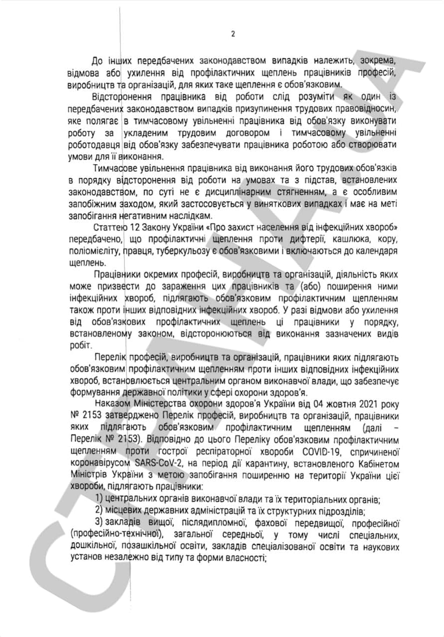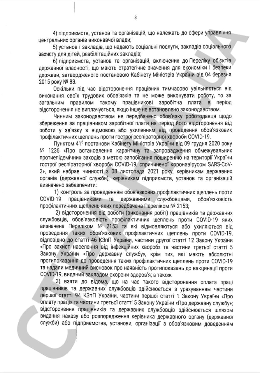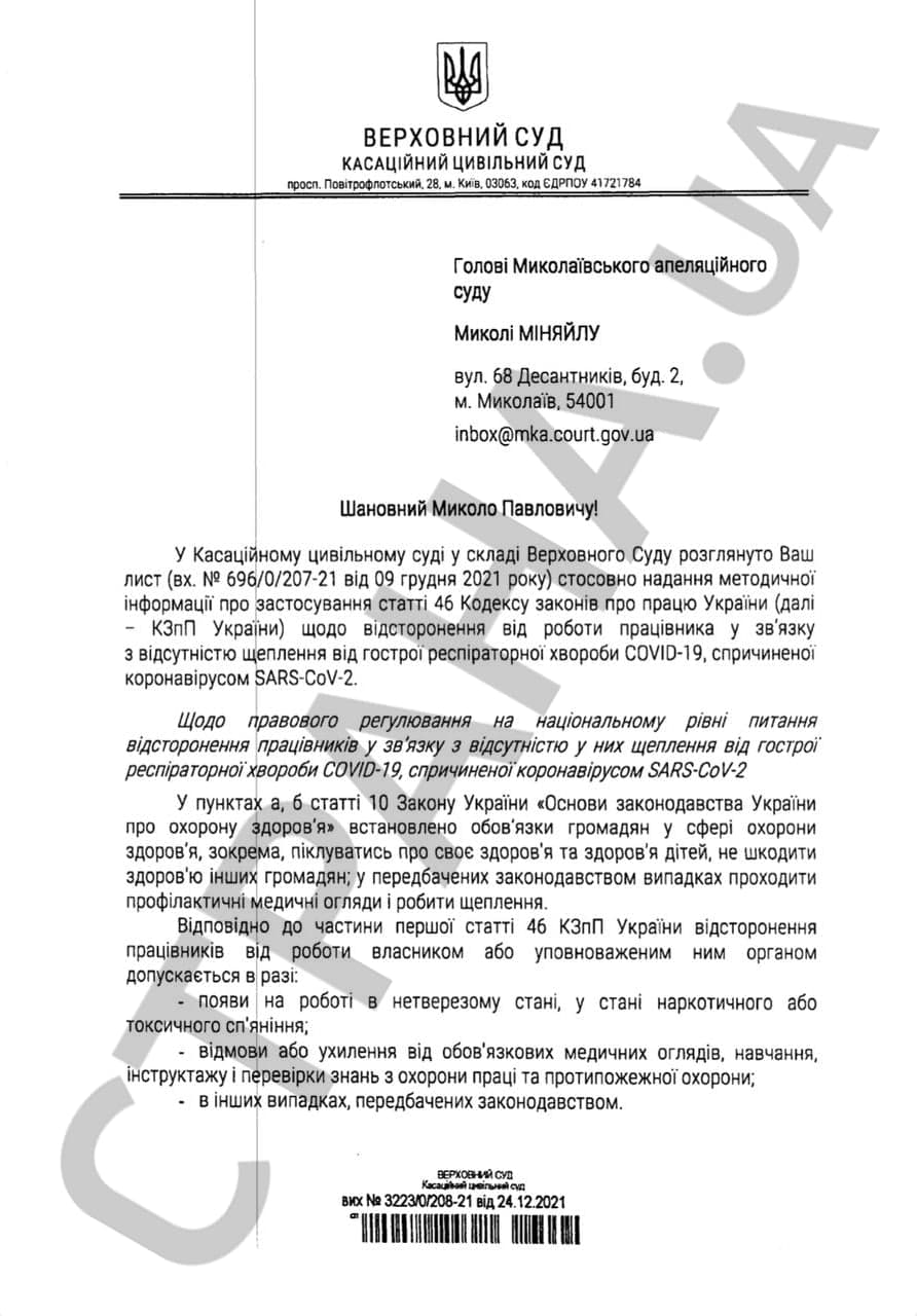 Эта методичка написана в ответ на запрос главы Николаевского апелляционного суда Николая Меняйло, который спрашивает у Кассационного гражданского суда, как применять статью 46 КЗОТа в части отстранения непривитых сотрудников учреждений и предприятий, включённых в перечень приказа МОЗ об обязательной вакцинации от ковид-19.